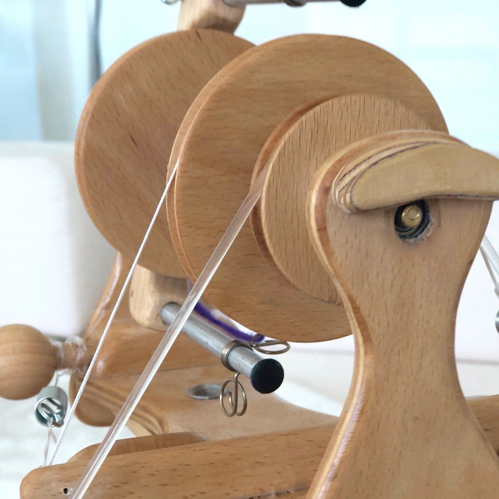 Das Samhain ist ein spulengebremstes Rad, was vieles verzeiht und deswegen auch für Anfänger gut geeignet ist. Genauso lässt sich damit auch feinstes Lacegarn spinnen. Das Einzugsloch ist mit 10mm Durchmesser auch für Perleneinzug und dickes Artyarn geeignet.