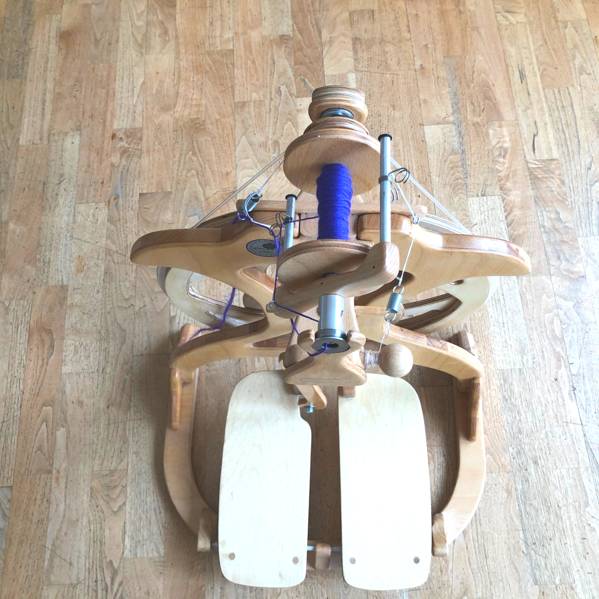 - Der Treibriemen verfügt über eine ‚Parkmöglichkeit', sodass man jederzeit die Arbeit unterbrechen und den Spinnflügel abnehmen kann, z.B. um einen anderen Wirtel zu verwenden, ohne danach den Riemen neu aufs Schwungrad ‚auffädeln‘ zu müssen.‘