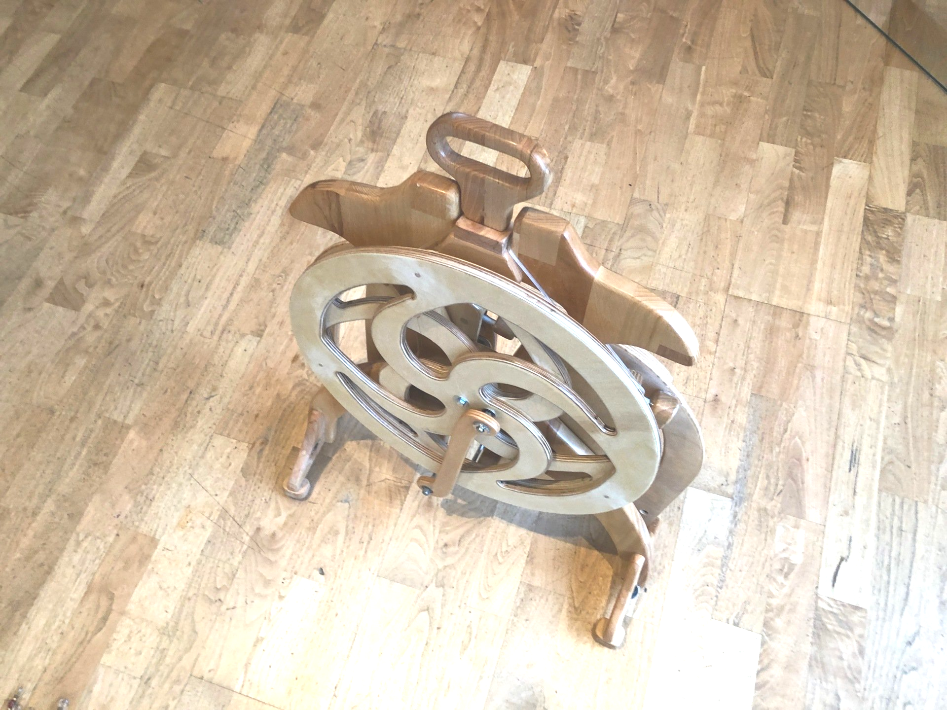 Erwähnenswert ist vielleicht noch, dass außer dem Treibriemen und den optional verwendeten Antirutschpads keinerlei Kunststoffe verbaut wurde. Sämtliche Teile des Rades und auch der Spulen bestehen aus Holz und Metall.